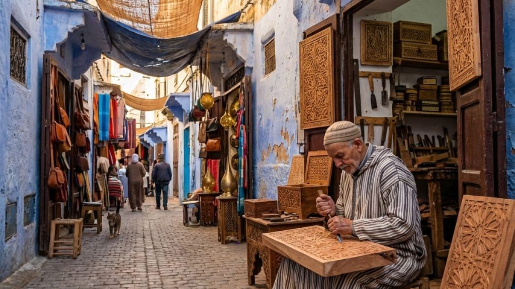I first noticed this while wandering without a plan through the medina. Not shopping, not searching. Just walking. A craftsman sat cross-legged near a wooden frame, weaving patiently as if time had agreed to slow down for him. No display window. No sign. Just work, quietly continuing a tradition older than the street itself.