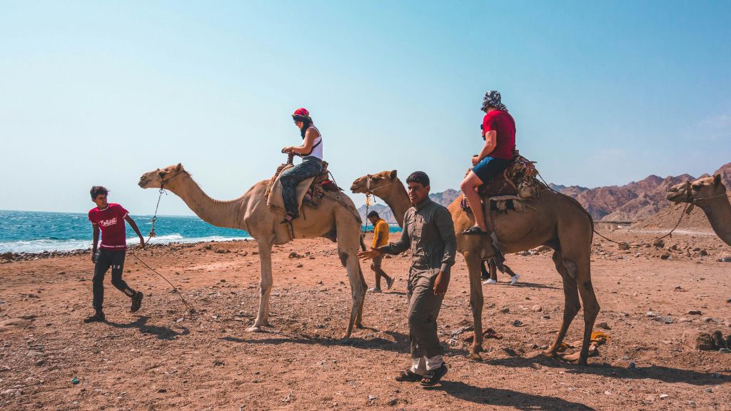 Romantic camel ride at sunset